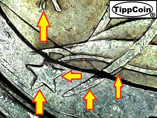 Verdoppelte Sterne: Mehrere Sterne erscheinen doppelt gestempelt, ein typischer Fehler bei minimal verschobenen Prägestempeln.