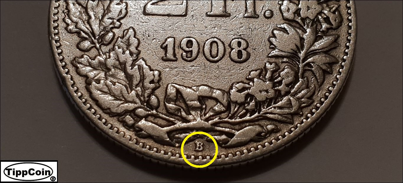 2 Franken 1908 B Schweiz 835er Silbermünze